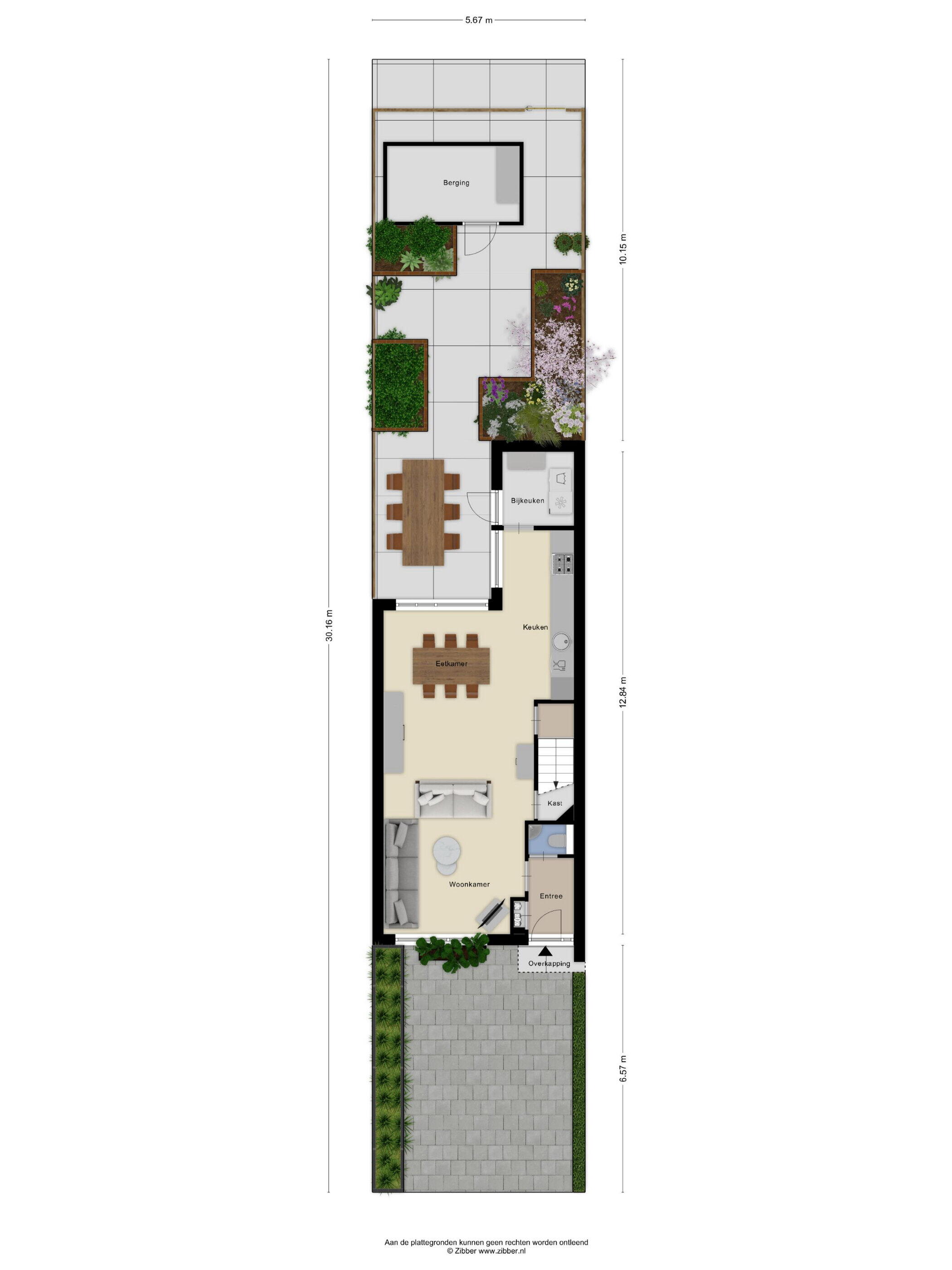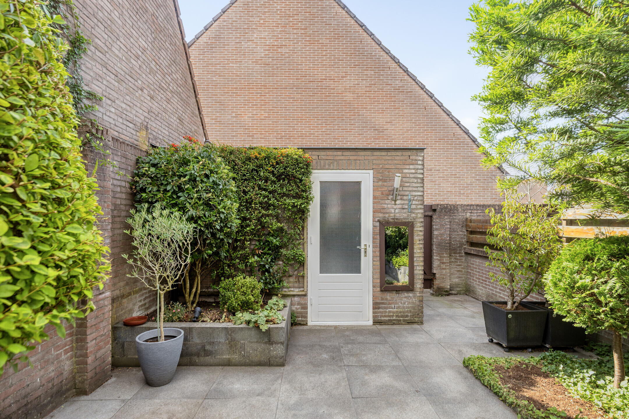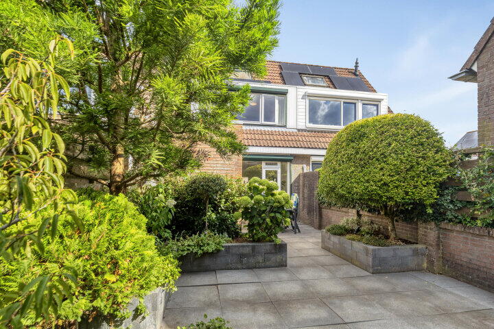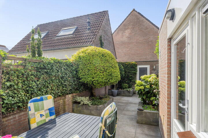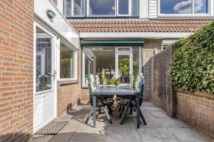De speelse achtertuin is verrassend veelzijdig! Direct achter de woning ligt een betegeld terras waar je gezellig buiten kunt eten of loungen. Verder vind je diverse plantenbakken voor een groene touch, een stenen berging voor de fietsen én een achterom voor extra gemak.