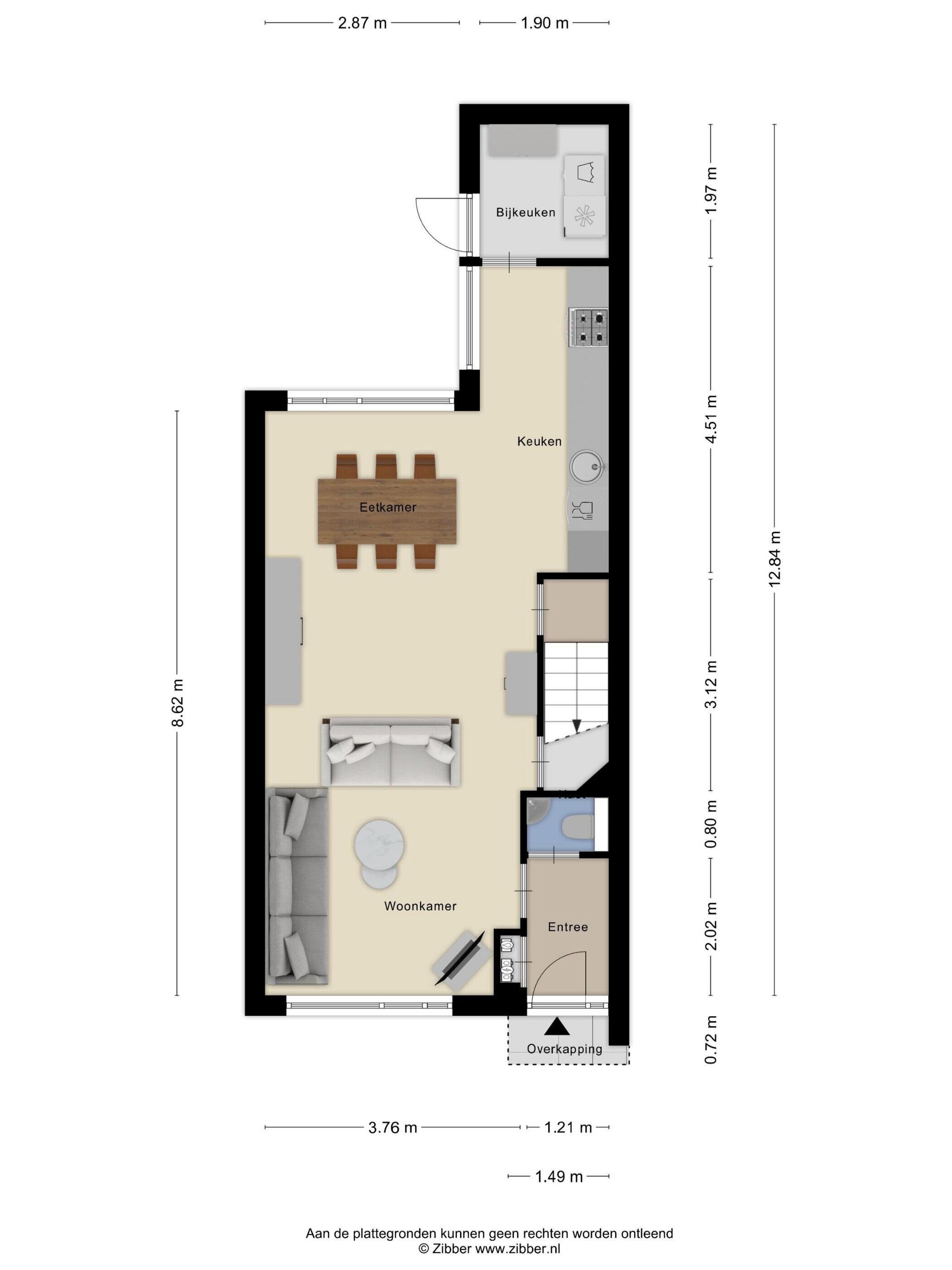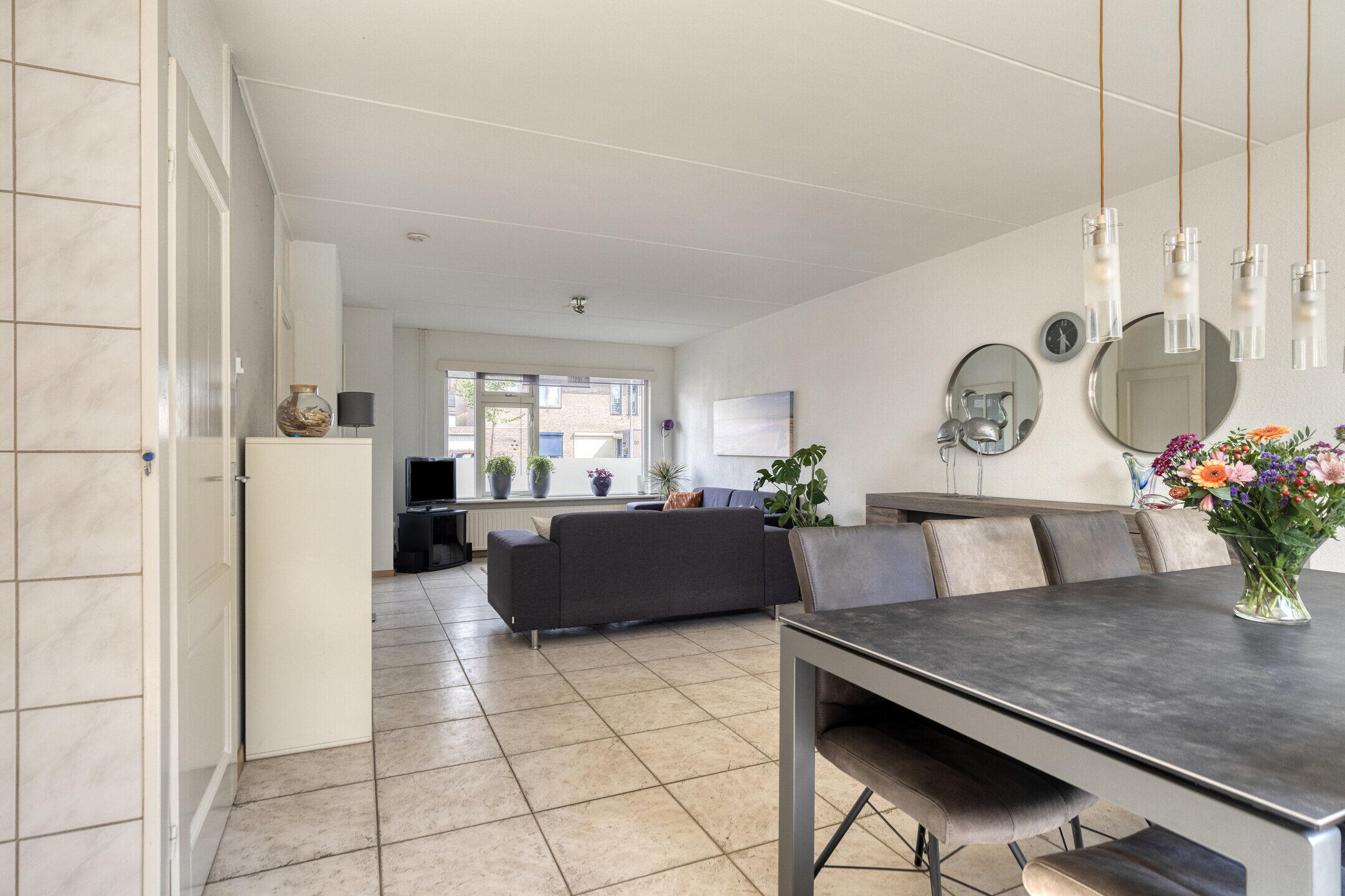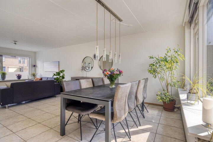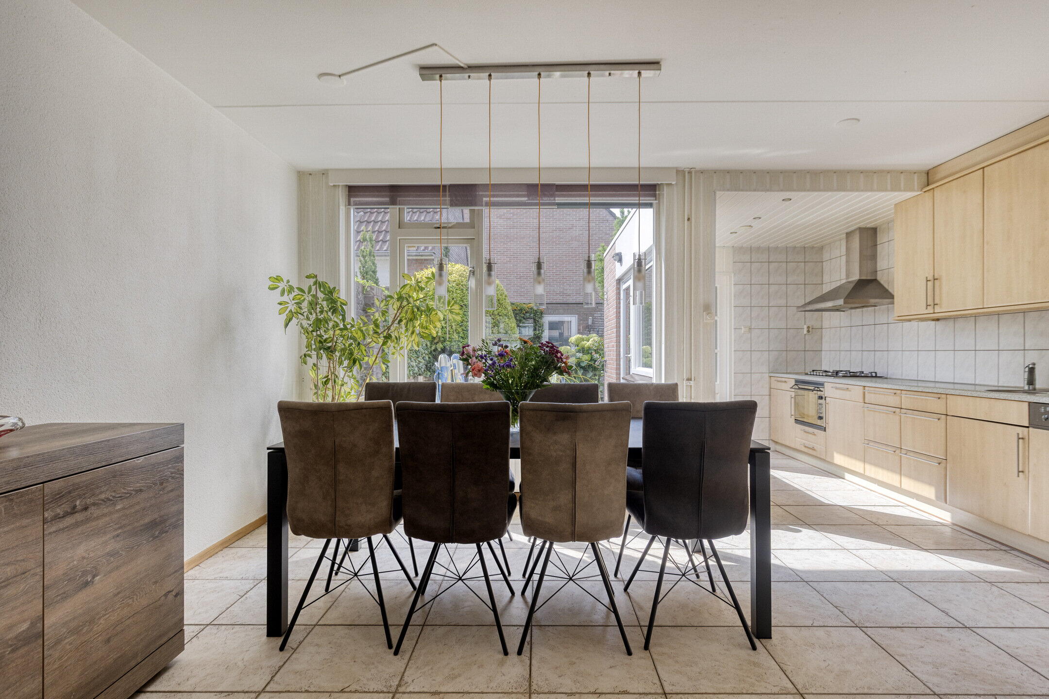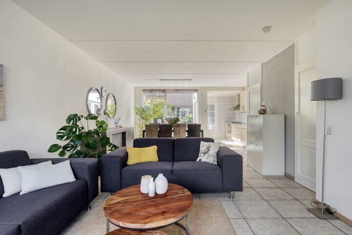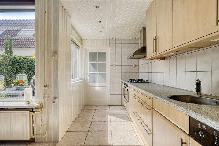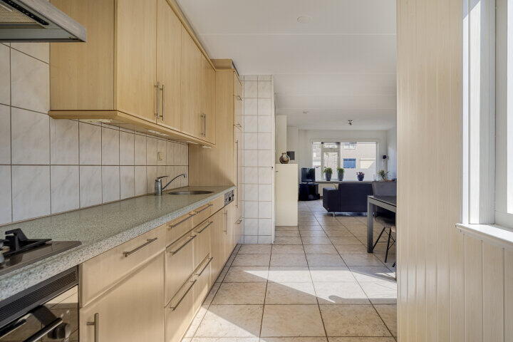De woonkamer is heerlijk licht door de grote ramen aan de voor- én achterzijde. Aan de voorkant vind je het zitgedeelte – ruim genoeg voor een fijne hoekbank – terwijl het eetgedeelte centraal in de kamer ligt, met plek voor een royale eettafel. Er staat nu zelfs een tafel met acht stoelen! Een trapkast biedt extra bergruimte. De open keuken ligt aan de zijkant van de woning en is volledig uitgerust met veel kastruimte, een fornuis, afzuigkap, combi-oven, koelkast en vaatwasser. Vanuit hier heb je toegang tot de handige bijkeuken én de achtertuin.