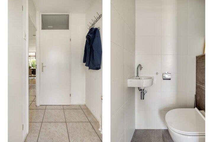 Via een nette, onderhoudsvriendelijke voortuin met een groene plantenborder, stap je de woning binnen. In de hal tref je het toilet, de meterkast en heb je direct toegang tot de woonkamer. Een verzorgde eerste indruk!