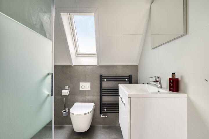 De badkamer is modern en strak afgewerkt met een wit wastafelmeubel, inloopdouche en een tweede toilet.